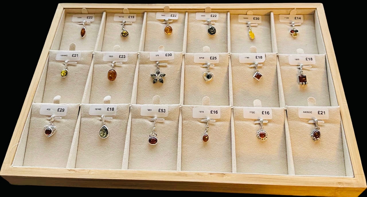 Retail display containing 18 sterling silver Baltic amber pendants, like new dealer overstock