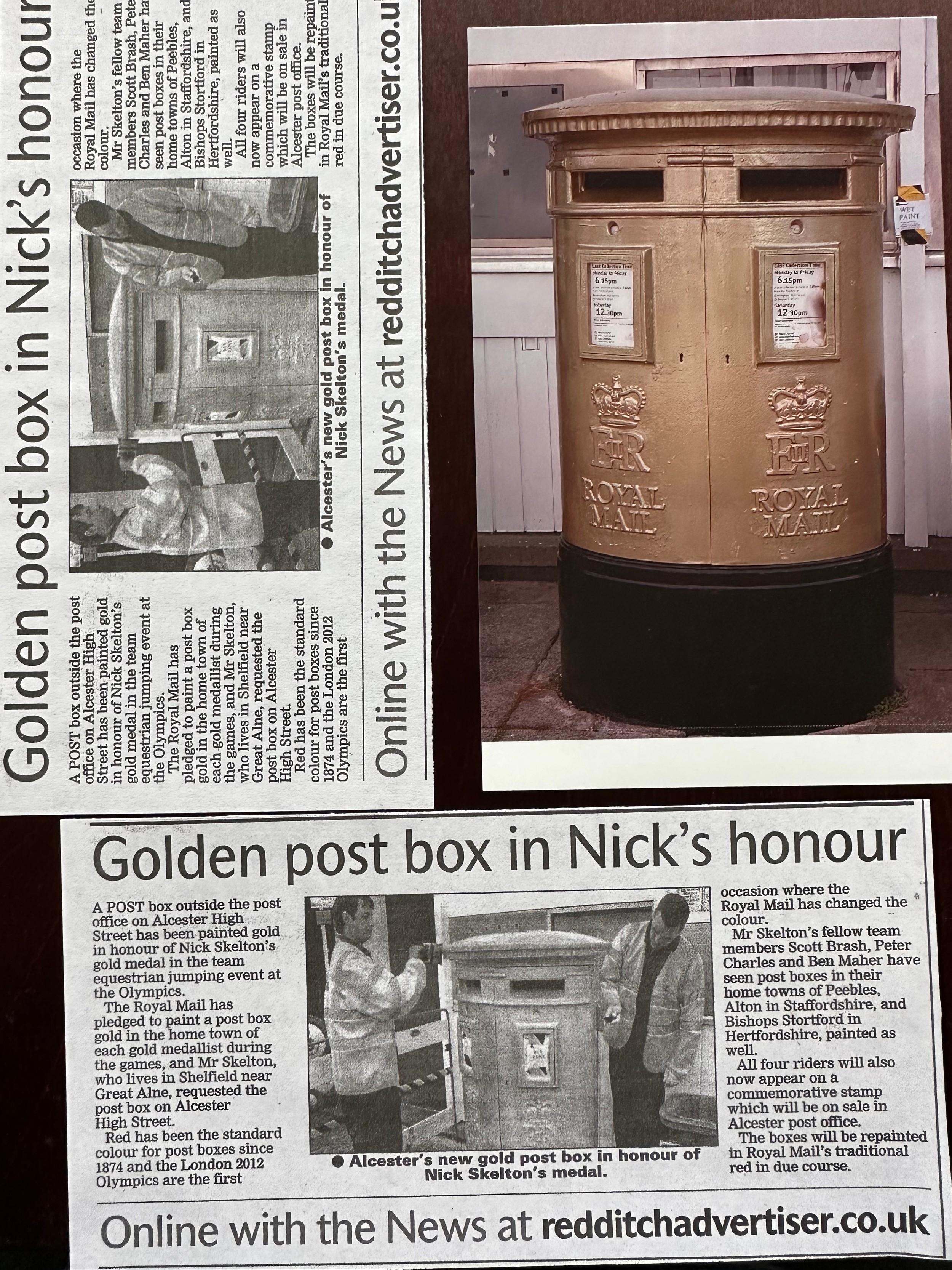 Postal history picture and copy newspaper cutting of gold post box commemorating gold medals won in 2012 London Olympics