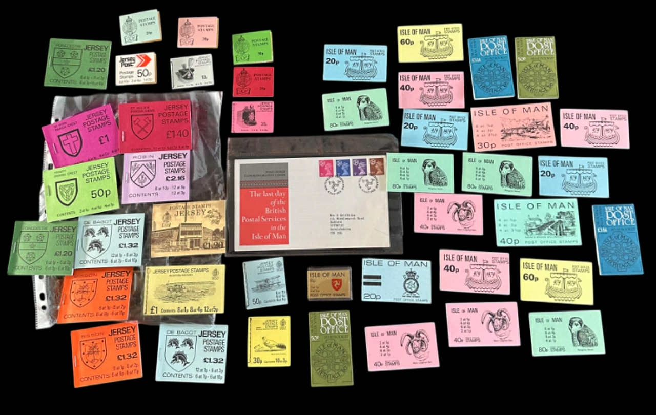 Collection of vintage Mint stamp booklets from Isle of Man and Jersey complete with stamps and a IOM FDC
